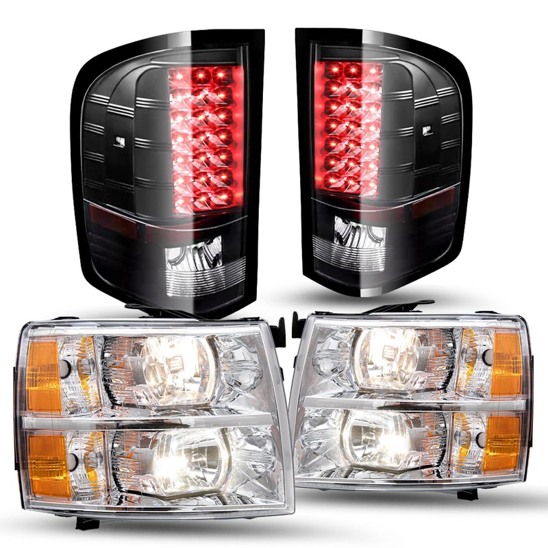 JSBOYAT Headlight & LED Taillights Assembly Fits for 2007-2013 Chevy Silverado 1500 / 07-14 Silverado 2500 3500 HD Halogen OE Style Factory Headlamp Replacement Pair Set Chrome Housing Amber Reflector