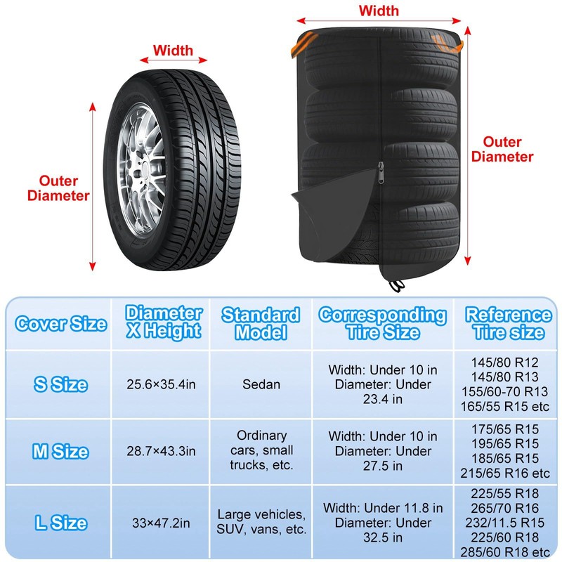 - Tragbare Aufbewahrungstasche in 3 Größen: passend für Reifen bis zu 82,5 cm Durchmesser (L: 83,8 x 119,4 cm). Wählen Sie S/M/L-Größen für Autos, LKWs, SUVs, Wohnmobile und Wohnwagen. Enthält eine kompakte Tragetasche zum einfachen Falten und Aufbewahren. ※Messen Sie Ihren Reifen vor dem Kauf!