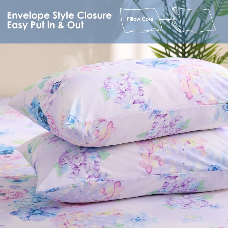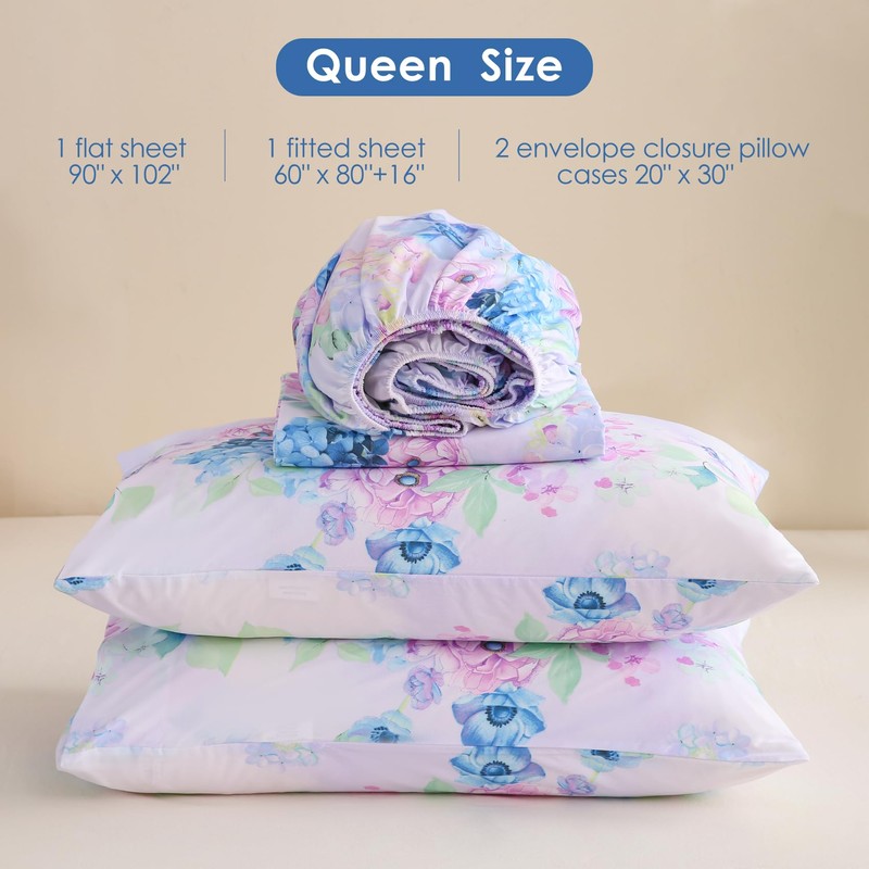 JSD Purple Hydrangea Floral Sheet Set Queen Size, 4 Piece Printed Microfiber Bed Sheets Deep Pocket