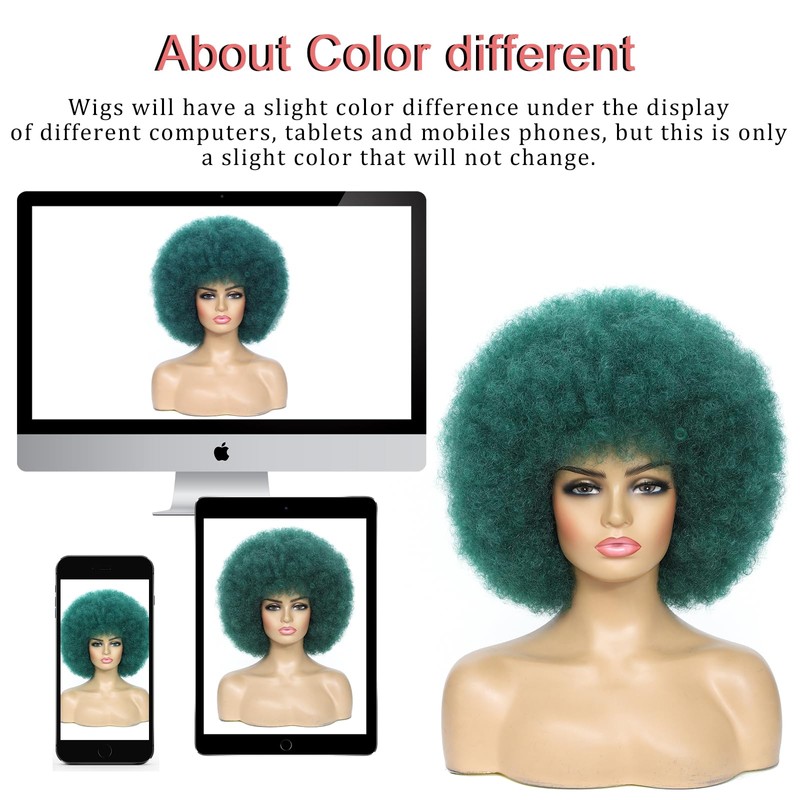 JSDshine Green Afro Wigs for Women - Soft 70s Kinky Curly Synthetic Hair Wig with Bangs, Natural Looking Short Afro Puff Bouncy Big for Daily & Party Use