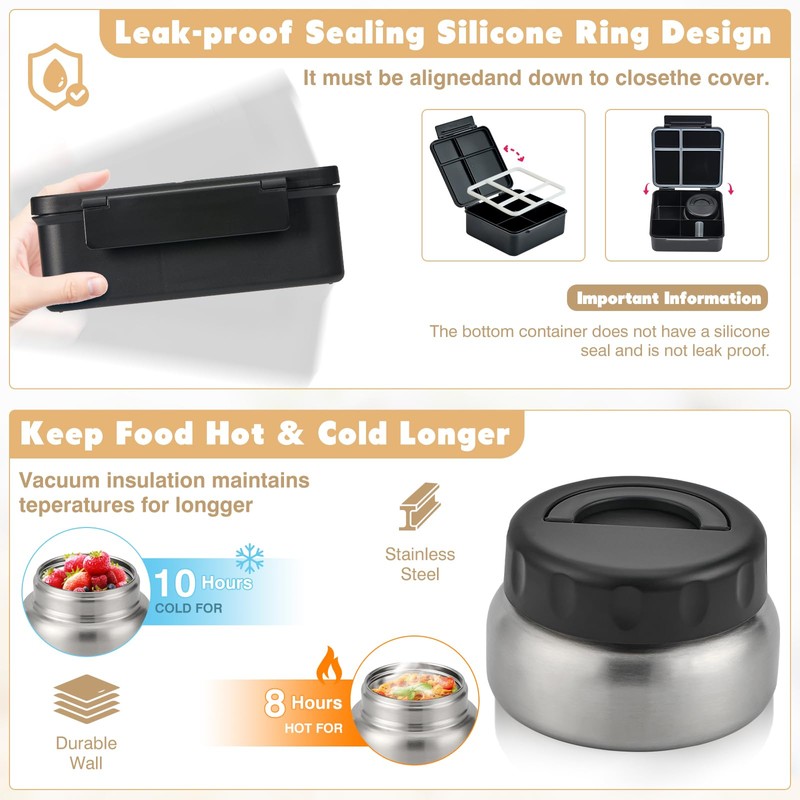 - 8OZ INSULATED FOOD JAR: KEEPS FOOD HOT/COLD FOR HOURS: Pack soups, yogurt, or pasta in our stainless steel thermos jar (8oz/236ml). Double-wall insulation keeps food hot 6+ hours or cold 8+ hours. Features a leakproof screw-top lid with silicone seal. Pro Tip: Pre-heat/chill for max performance! Fits perfectly inside the bento or works standalone.