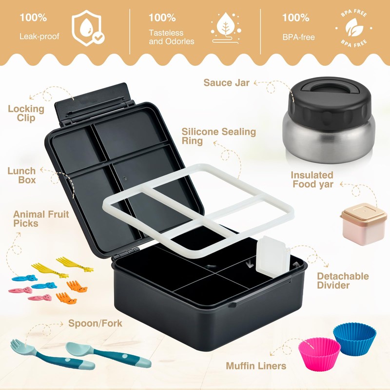 - LEAKPROOF BENTO BOX WITH ADJUSTABLE COMPARTMENTS: Never worry about spills or mixed flavors! Our 76oz kids lunch box features 3-4 customizable compartments with removable dividers. Upgraded silicone gaskets + a middle locking lid create 100% leakproof security, even when shaken upside down. Includes built-in utensil storage! Made from food-grade, odorless materials to keep meals fresh and safe.