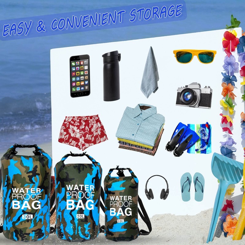 - 3 sizes to choose from: 3 types of capacities made of waterproof bag can meet your different needs: 10L, 20L, 30L. It is very suitable for storing clothes, shoes, your camera, smartphones, electronics, towels, blankets, sleeping bag, etc.