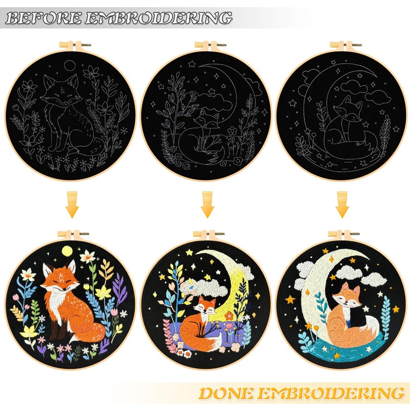 - Fox Embroidery Kit: The package includes 3 pieces fox pattern print design embroidery cloths, 1 embroidery hoop, 3 English instructions, 1 scissors, 1 needle threader, 6 needles and three sufficient embroidery threads. The complete accessories are enough for you to start embroidery