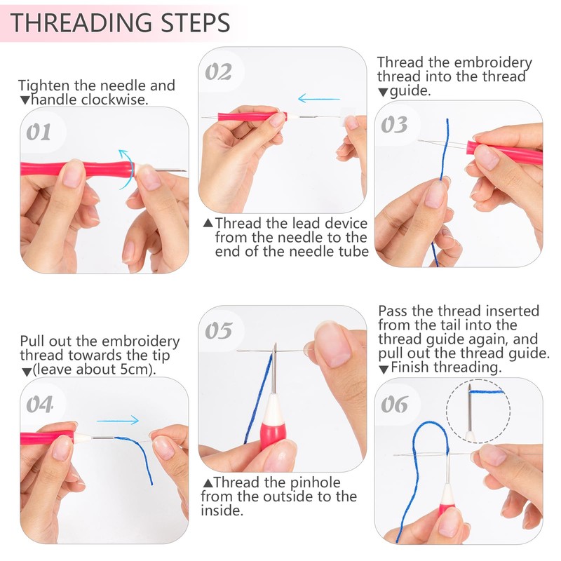 - Box contents: contains 1 x embroidery frame, 1 x adjustable embroidery pen, 1 x embroidery cloth, 1 x needles, enough cotton yarn, threading tools and instructions (English language not guaranteed)
