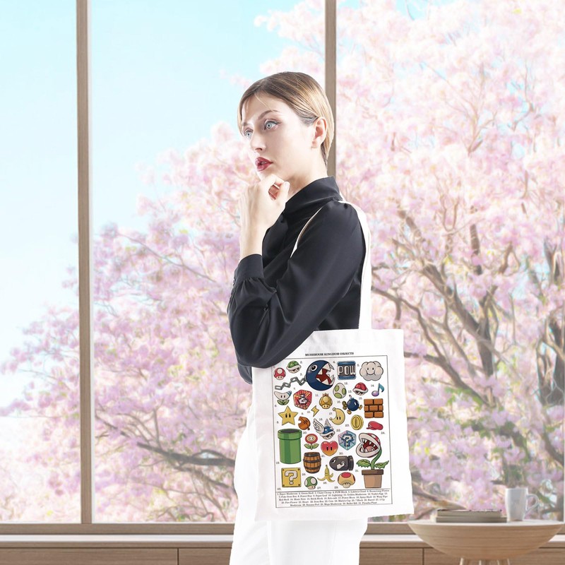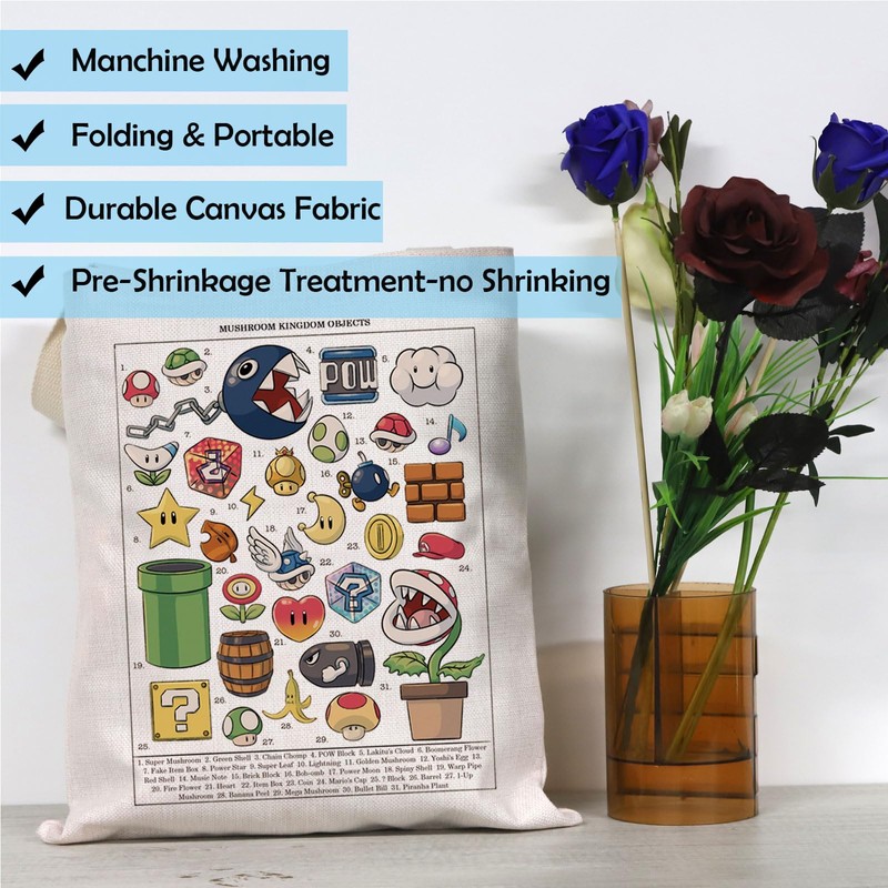 JTOUK Super M Movie Video Game Inspired Gift Mushroom Kingdom Objects Game Lover Tote Bag for Video Gamer (Kingdom Objects Tote EU)