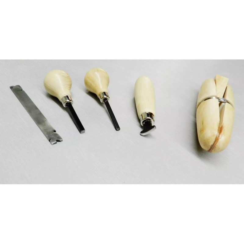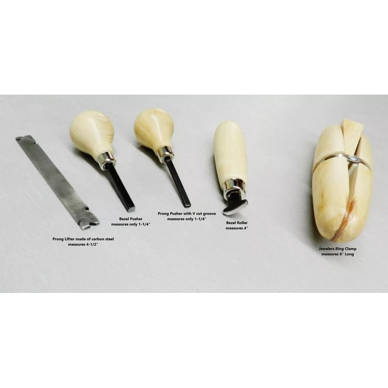 Jewelry Stone Setting Set contains 5 Pieces - includes a Jewelers Ring clamp, prong pusher, bezel pusher, and bezel roller with durable tips all mounted on ergonomic smooth fine finish wooded handles along with a metal Prong Lifter.