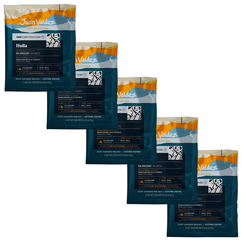 Juan Valdez | Café Drip Huila, café molido con filtro individual Balanceado de Colombia, Notas de naranja y caramelo | 5 sobres 10 g cada uno