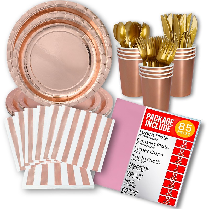 - ALL-INCLUSIVE CONVENIENCE - Experience the convenience and take the stress out of party planning with our comprehensive shiny rose gold paper plates and napkins party supplies. This set includes a total of 84 pcs. of rose gold plates, napkins, cups, spoons, forks, and knives, plus 1 tablecloth.