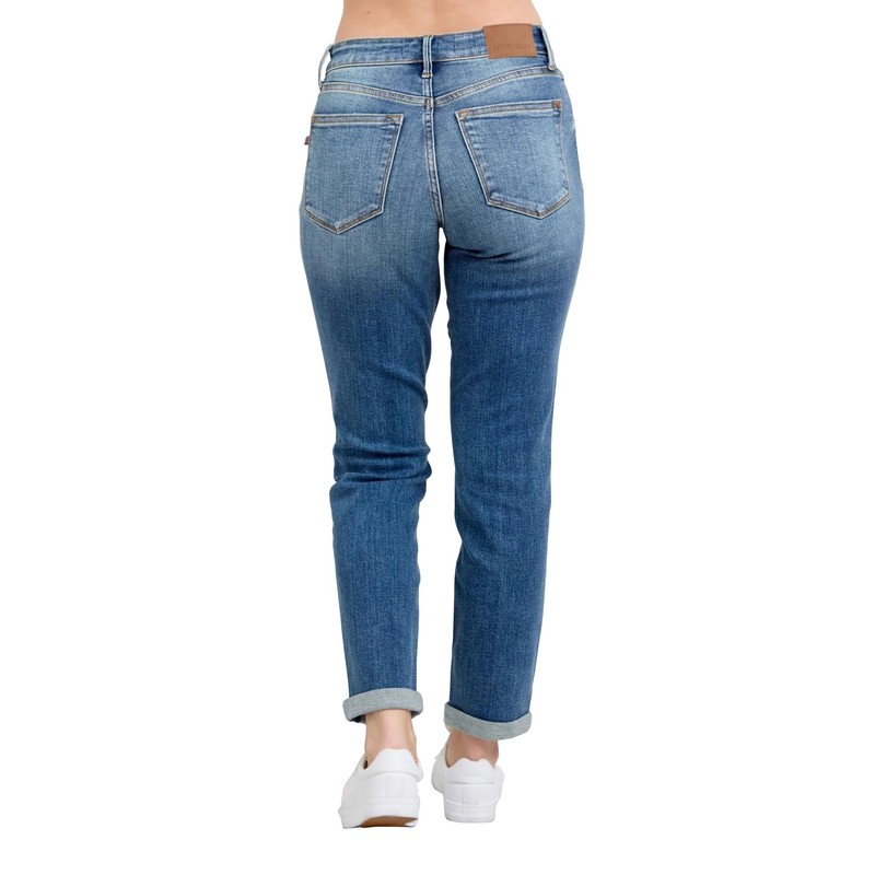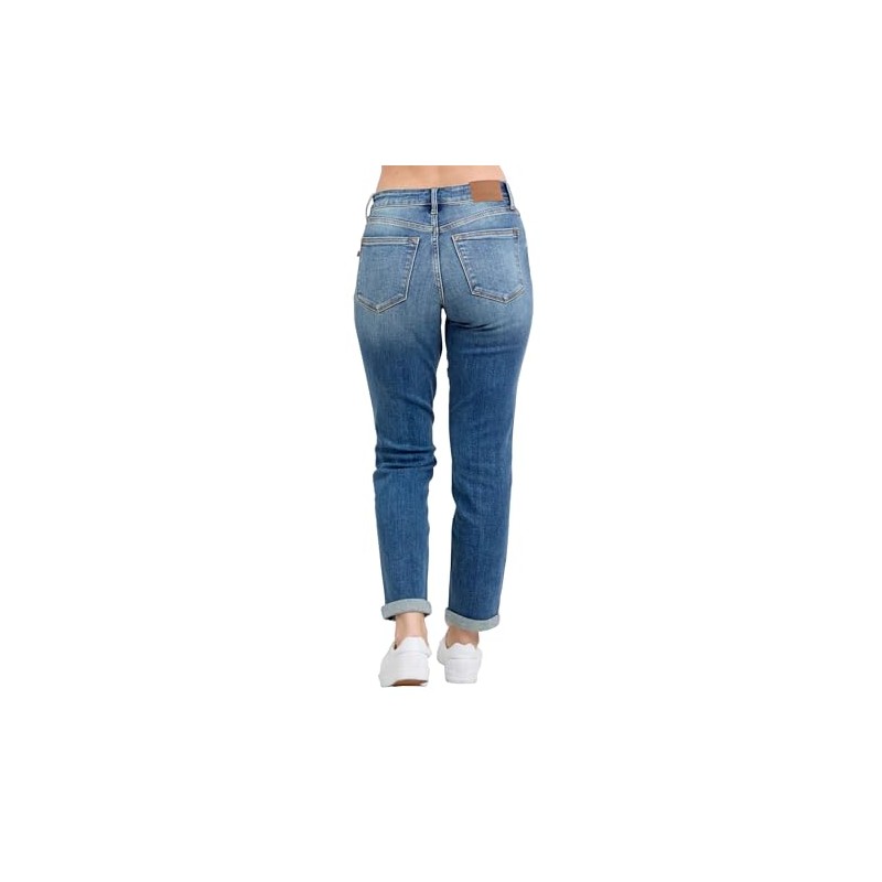 Judy Blue is a premium women's denim jeans company located in the fashion district of Los Angeles. Judy Blue's mid rise cuffed boyfriend jeans. These jeans have basic 5-pocket, Stretch, Solid classic denim blue, Zip fly closure.