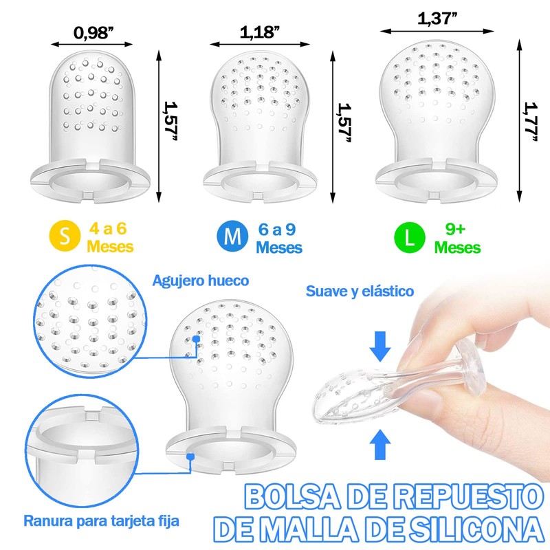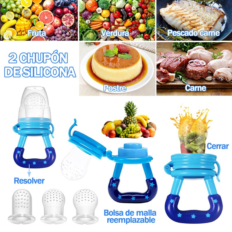 Dos chupón de frutas son adecuados para poner diferentes alimentos, y está equipado con tres bolsas de malla de silicona para chupetes de diferentes tamaños que se pueden reemplazar.