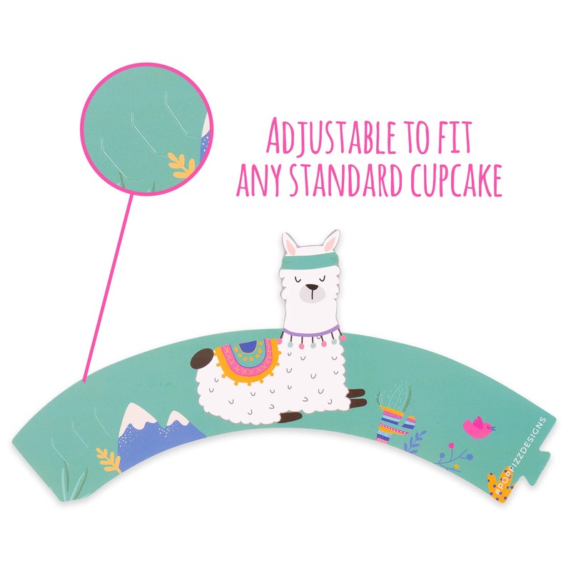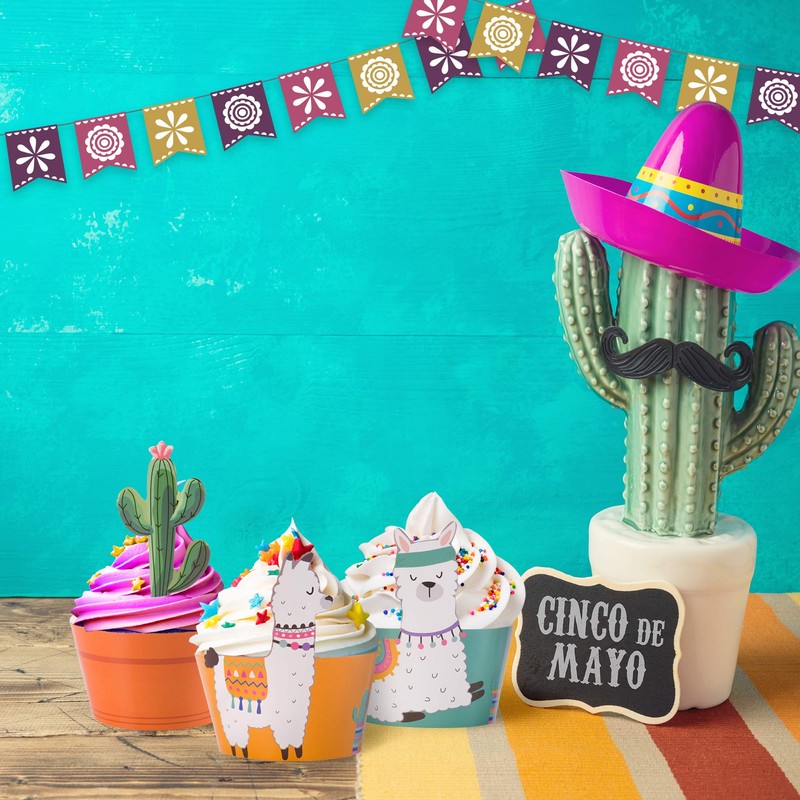 - Decoraciones 24 cupcakes: cada juego viene con 8 envoltorios de llama verde azulado, 8 envoltorios de llama amarilla, 8 envoltorios de terracota y 8 adornos de cactus.