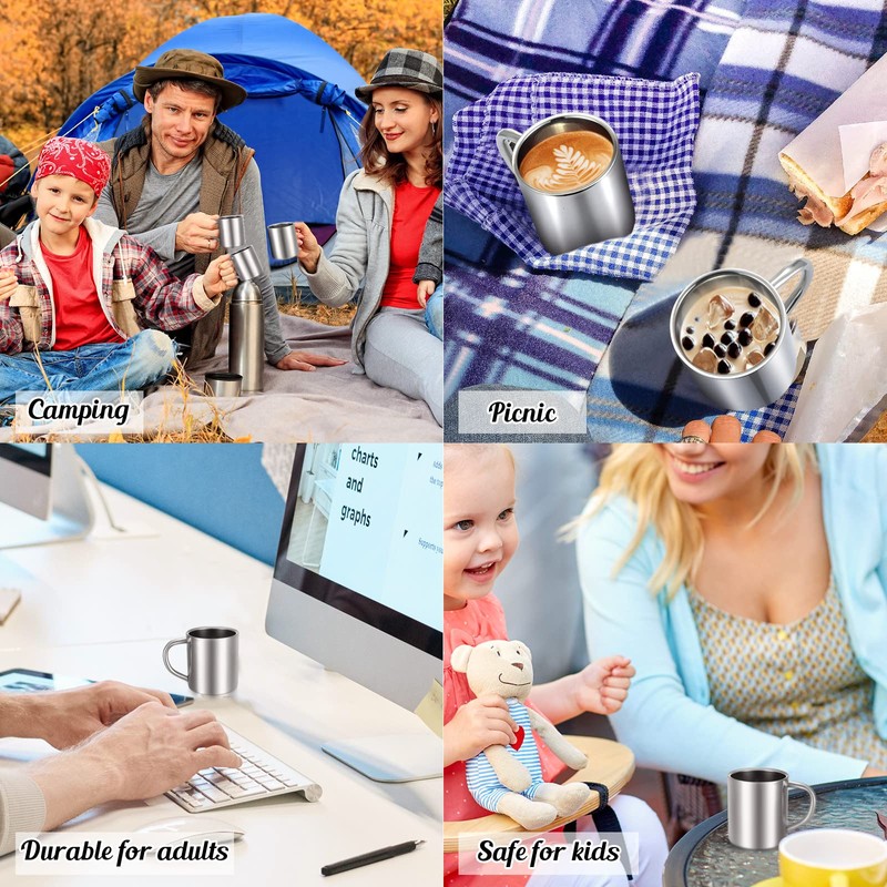 - pliamente utilizado: las pequeñas tazas de café de estilo industrial se pueden aplicar en casa, en oficinas y sobre la marcha, y también son aplicables para camping, picnic, senderismo, equipo de restaurante, etc. El paquete contiene 4 tazas de café aisladas de acero inoxidable con asas, suficientes para familias y otros grupos