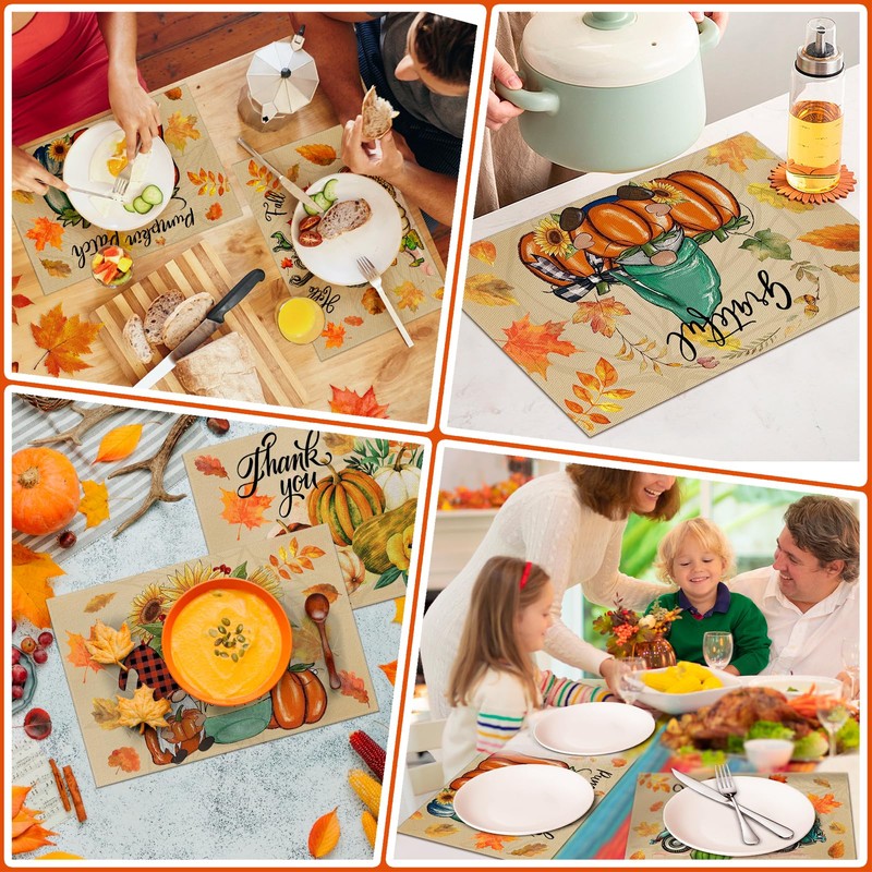 Juego de 6 manteles individuales para otoño, diseño de calabaza, hojas de arce, gnomos, mesa de comedor, 12 x 18 pulgadas, estacional de otoño, cosecha festiva, rústico, clásico, Acción de Gracias