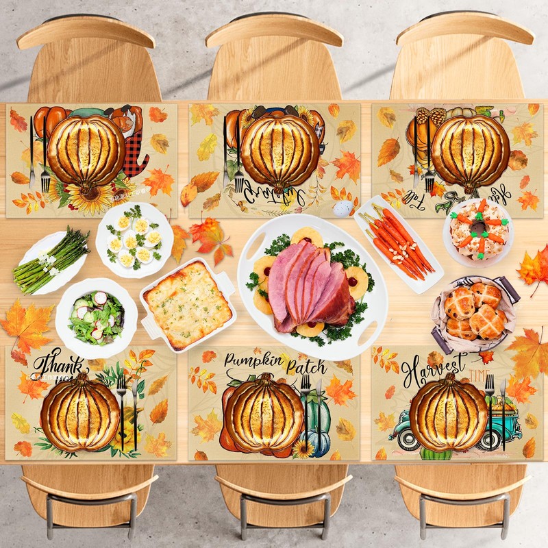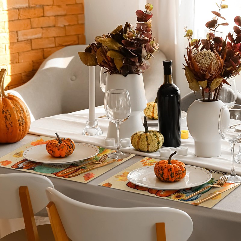 - Tamaño de los manteles individuales: un juego de 6 manteles individuales de hola y otoño, cada uno mide aproximadamente 30 x 45 cm. Este mantel individual de calabaza es fácil de limpiar. Se puede lavar a máquina o a mano en agua fría. Se puede secar.