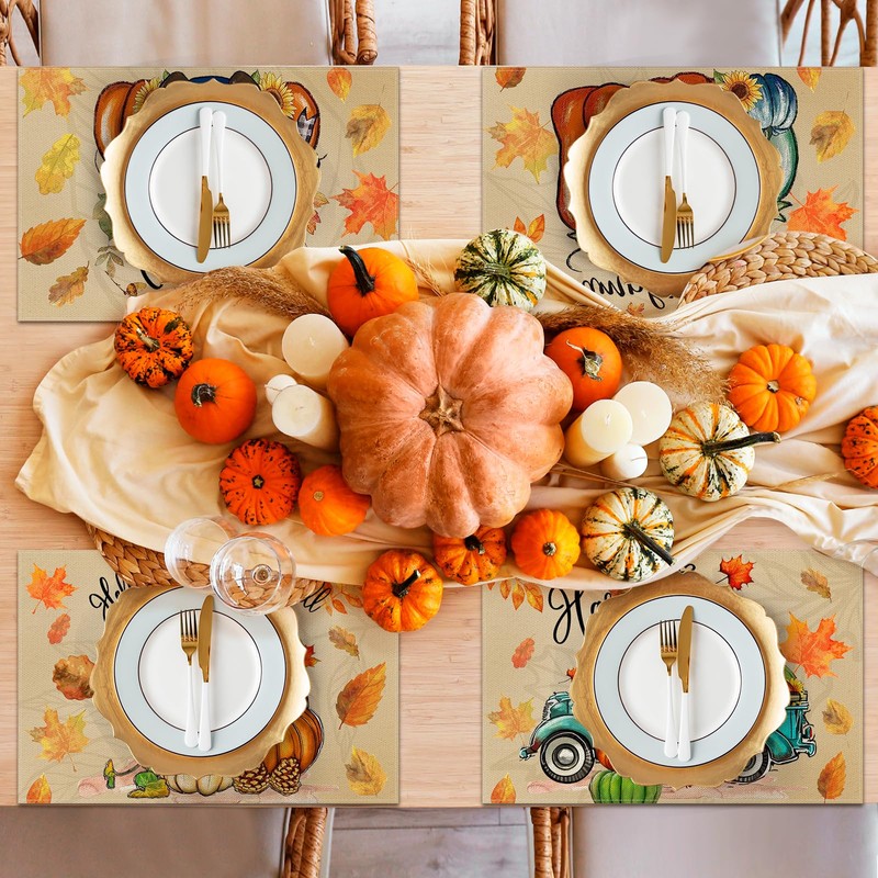 - Cuidadosamente diseñado para otoño: recibirás 6 estilos diferentes de manteles individuales Hello Fall cada uno de los cuales es único y hermoso. Con calabazas, hojas de arce y gnomos y camiones, estos diseños añaden un toque festivo a tu hogar, dan a tu hogar un ambiente de cosecha de otoño y añaden más opciones para la decoración del hogar de otoño.