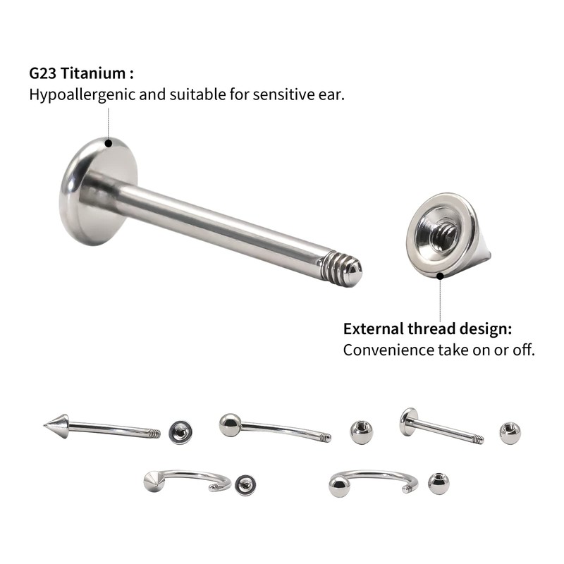 - Fabricado con titanio G23, es mejor que el acero inoxidable 316L de grado quirúrgico, duradero e hipoalergénico, completamente no corrosivo, sin plomo ni níquel, también resistente a ácidos, álcalis, no se decolora, sin distorsión, perfecto para pieles sensibles.