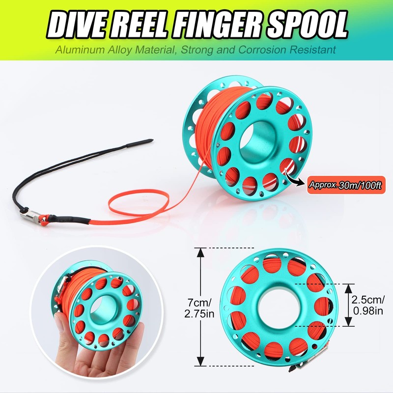 - Carrete de buceo: carrete de aleación de aluminio, ligero y duradero. Y línea plana de nailon trenzado de 100 pies con color naranja de alta visibilidad para mejorar la visibilidad bajo el agua y sin enredos. Viene con un gancho de doble extremo de acero inoxidable para enganchar fácilmente tu BCD.