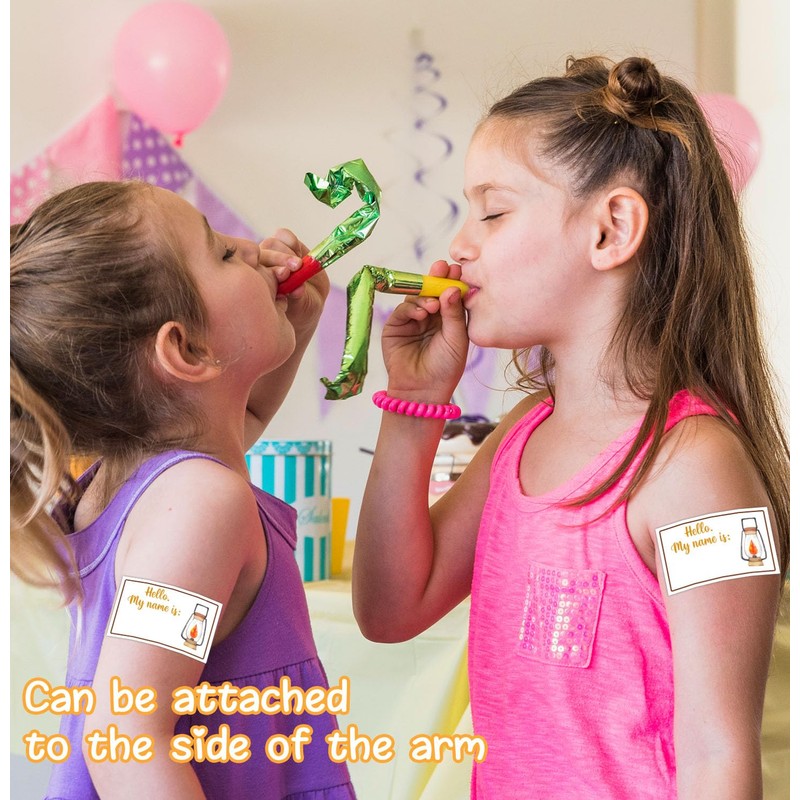 • Tamaño: el cartel de juego mide 5 x 7 pulgadas y se puede colocar en partes importantes de la fiesta sin ocupar espacio, y las pegatinas de etiqueta de nombre de 3.5 x 2.1 pulgadas y se pueden fijar al brazo o la ropa.