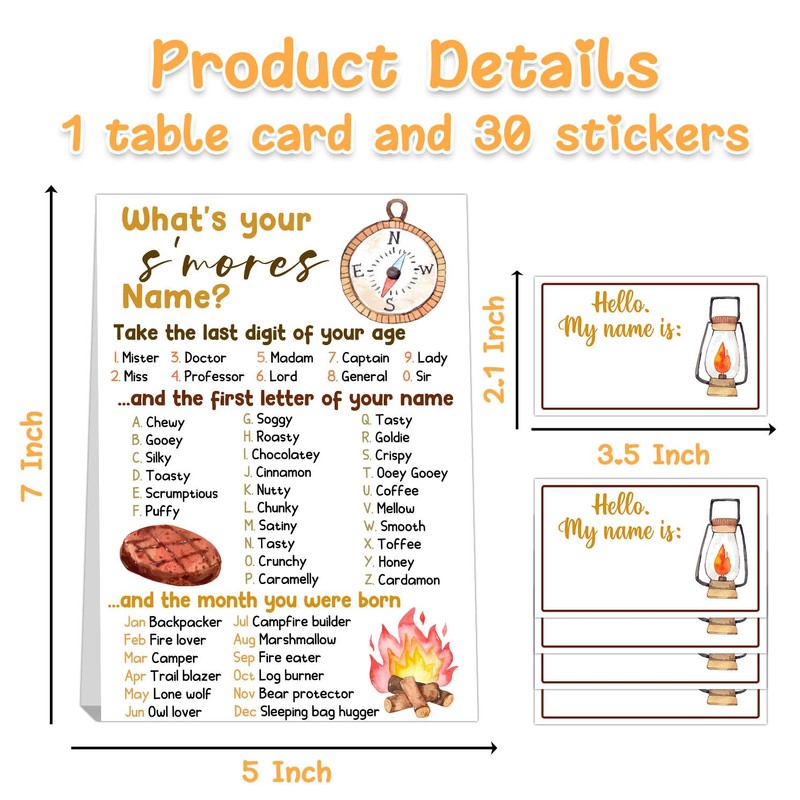 Divertido juego de fiesta: ¿Cuál es tu nombre de S'mores? Esto es justo lo que puedes jugar en tu fiesta para que tus invitados se sientan nuevos y divertidos. 30 pegatinas con etiqueta de nombre y un cartel. Nuestras tarjetas están impresas con tecnología de alta calidad, con impresión de gráficos claros, colores brillantes, no se decolora fácilmente, duraderas y respetuosas con el medio ambiente. No lo dudes, esta es la mejor opción para fiestas. ¡Déjanos disfrutarlo juntos!