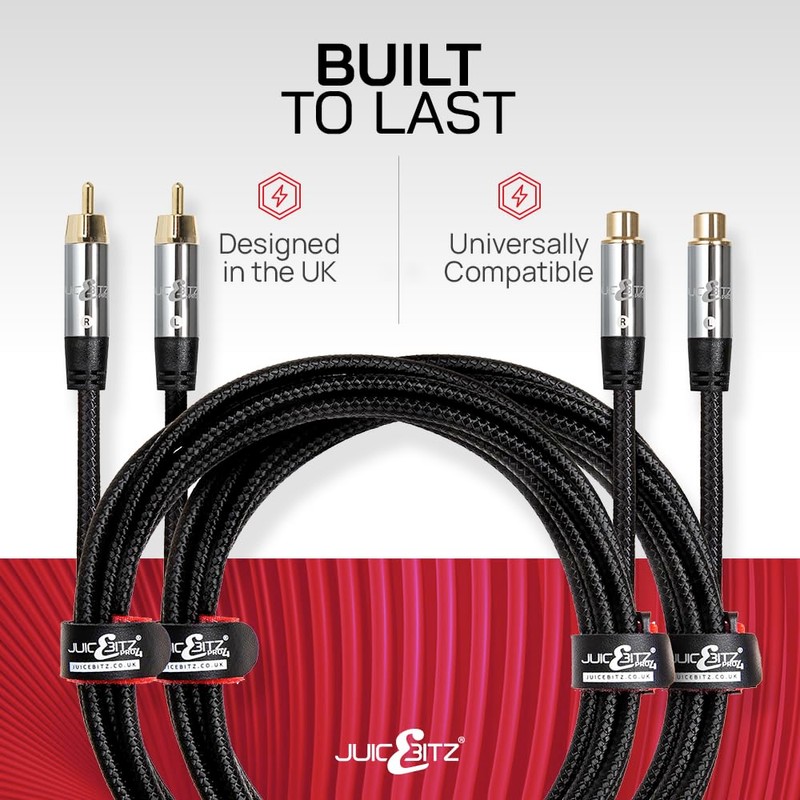 - IMPROVES SOUND QUALITY - enjoy high-performance audio with the JuicEBitz RCA Male to Female Phono Cable, meticously crafted to ensure flawless signal transmission and superior sound reproduction via the studio quality speaker wire