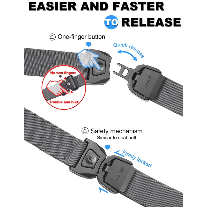 - ONE BUTTON QUICK RELEASE BUCKLE – The crafted heavy-duty buckle is made of zinc alloy. As long as you push the button on the buckle, the buckle would release instantly. It is super convenient to release your pants for doing whatever you want to do. You would never meet a belt so quick convenient like this. The designed buckle has very strong load-bearing capacity, which can meet your different wearing requirements