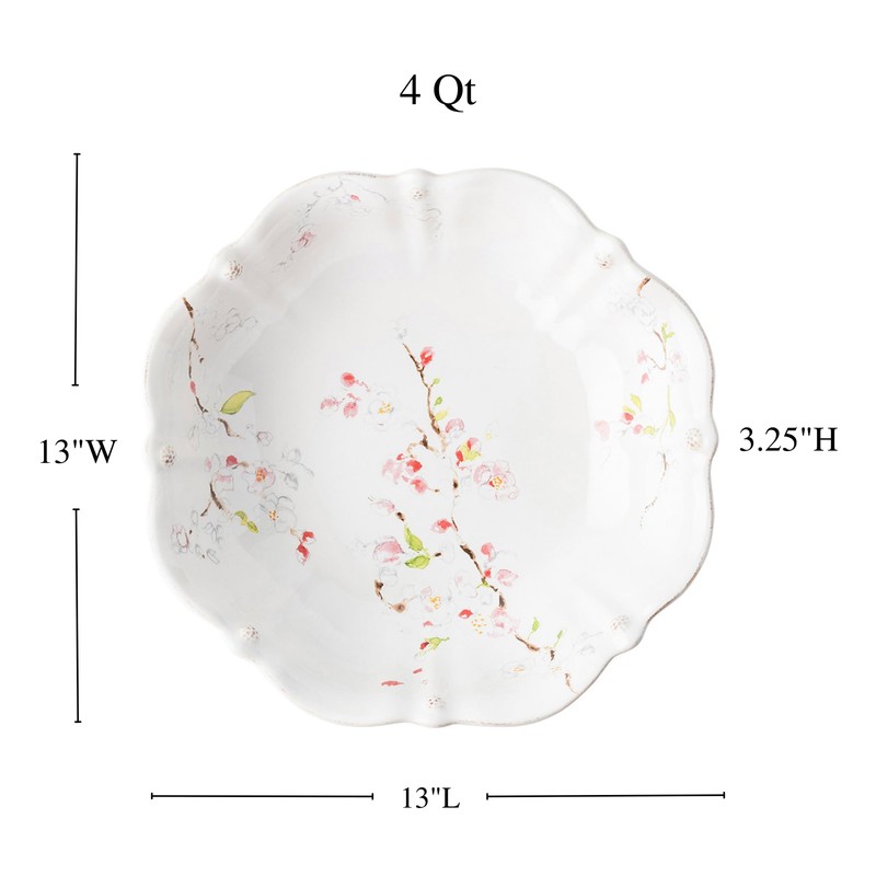 - SOPHISTICATED DESIGN: Juliska Berry & Thread Floral Sketch Cherry Blossom 13" Serving Bowl has a sophisticated and unique design. Made in Portugal and measures 13.0"W x 3.25"H x 13.0"L. 4 Qt. Capacity