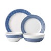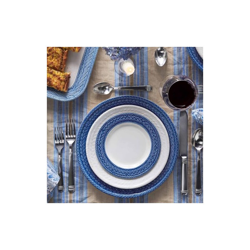 - Inspired by the French basket weave often found in equestrian and nautical traditions, the border is beautifully hand-painted in a windswept Delft Blue. Our 4 piece place setting contains a dinner plate, dessert/salad plate, cereal/ice cream bowl and coupe pasta/soup bowl.