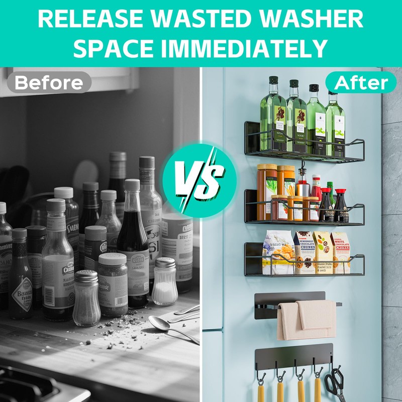- ✅【Space-Saving Powerhouse】Instantly unlock wasted vertical space with our 5 pack magnetic shelves! Secured by powerful magnets, it transforms the side of your washer or fridge into a clutter-free zone for detergents, and Kitchen supplies—no drilling or bulky cabinets needed. Organize smarter, not harder.