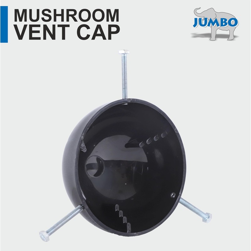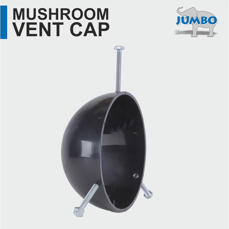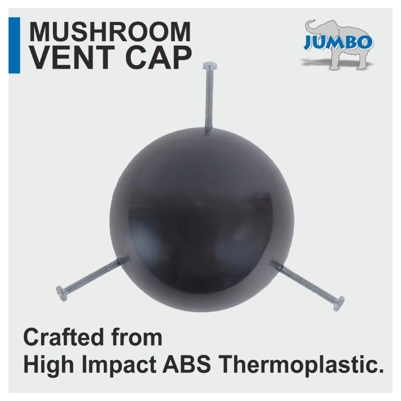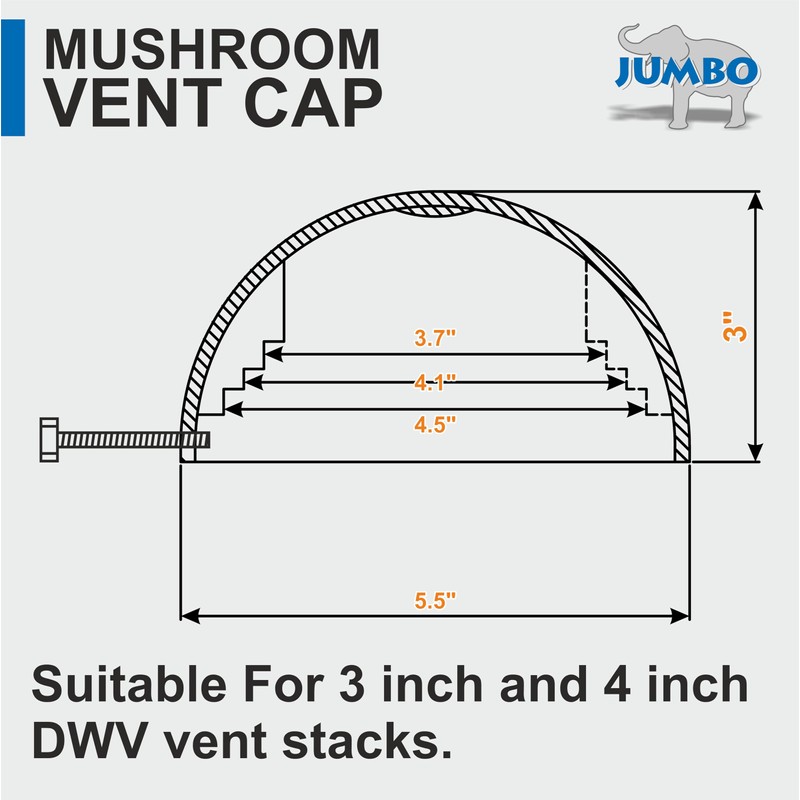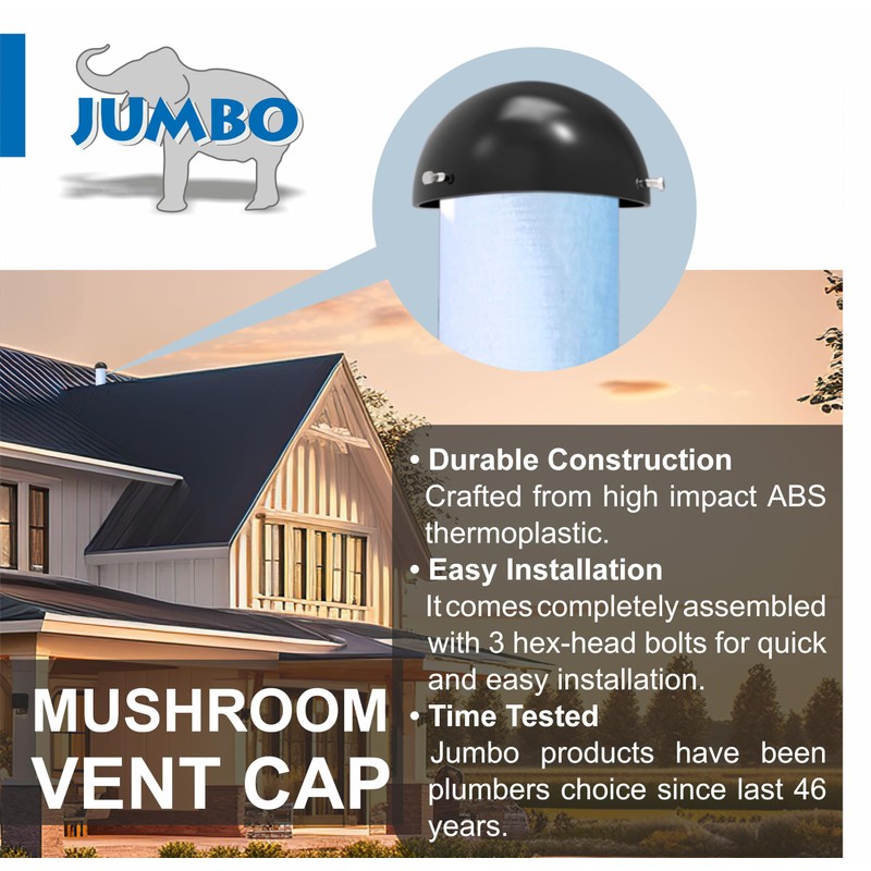 Jumbo vent cap is made out of high impact ABS thermoplastic material. It can fit 3 inch or 4 inch vent stacks to prevent entry of water, dust, debris or critters. It comes completly assembled with 3 hex-head bolts for quick and easy installation.Jumbo products have been time tested for over 46 years by Plumbers all across the USA.