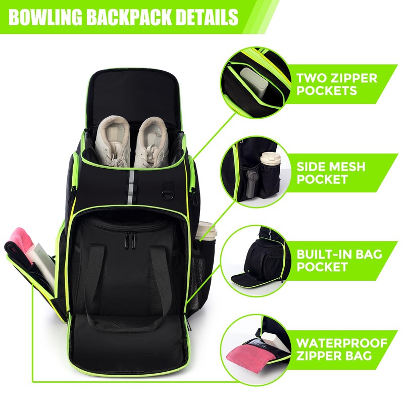 - MULTIPLE POCKETS: This bowling backpack offers ample space for all your bowling accessories and equipment. It includes a single ball bowling bag inside for your bowling ball. The top zippered compartment holds a pair of athletic shoes. Zippered side pockets are perfect for towels, wallets, keys, and phones. Two side pouches with elastic fit water bottles and other accessories