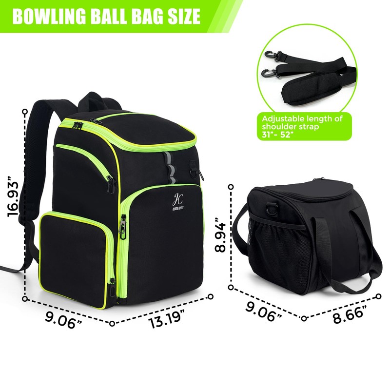 - HIGH QUALITY: This bowling ball backpack is made of sturdy materials to ensure it can withstand the weight.The top zipper pocket and side square pockets are lined with a waterproof coating process.Dimension of backpack: 13.19” *9.06” *16.93”. 33L capacity(Weight: 0.34kg).Dimension of bowling tote bag: 8.66” *9.06”*8.94”.The Softball backpack is a ideal size for youth player and adult