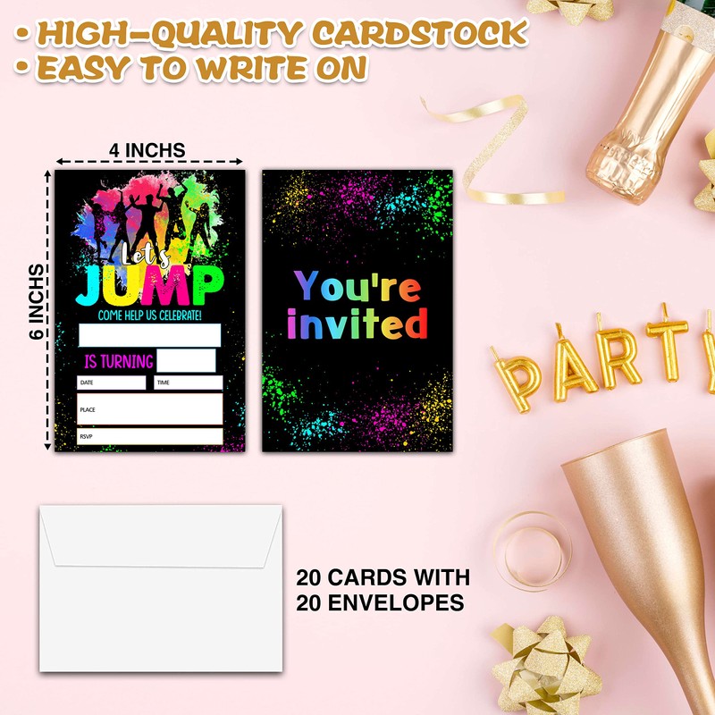 Jump Birthday Party Invitations, Trampoline Park Birthday Invitation, Double-Sided Splatter Paint Fill In Invites, Kids Bounce House Birthday Party Decorations, 20 Cards With 20 Envelopes(C13)