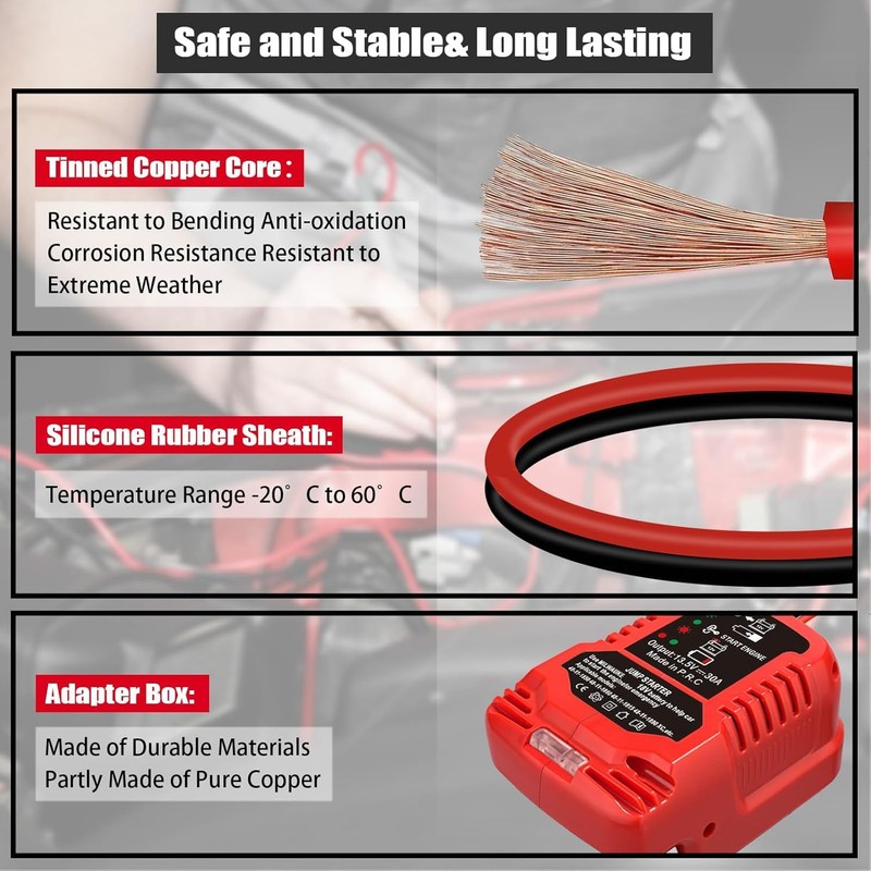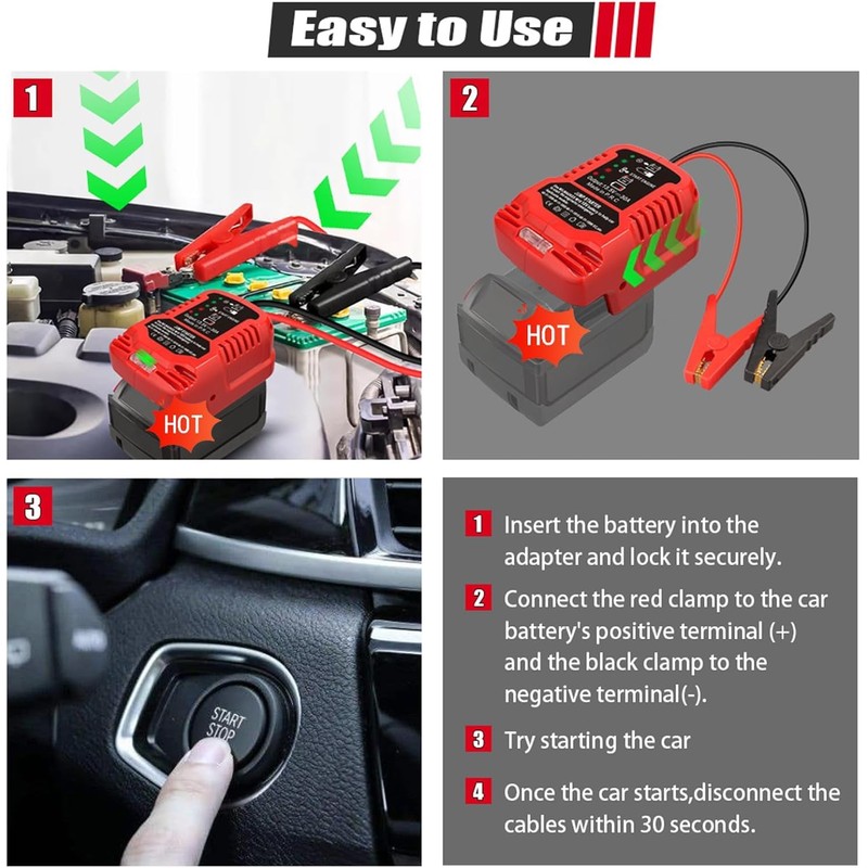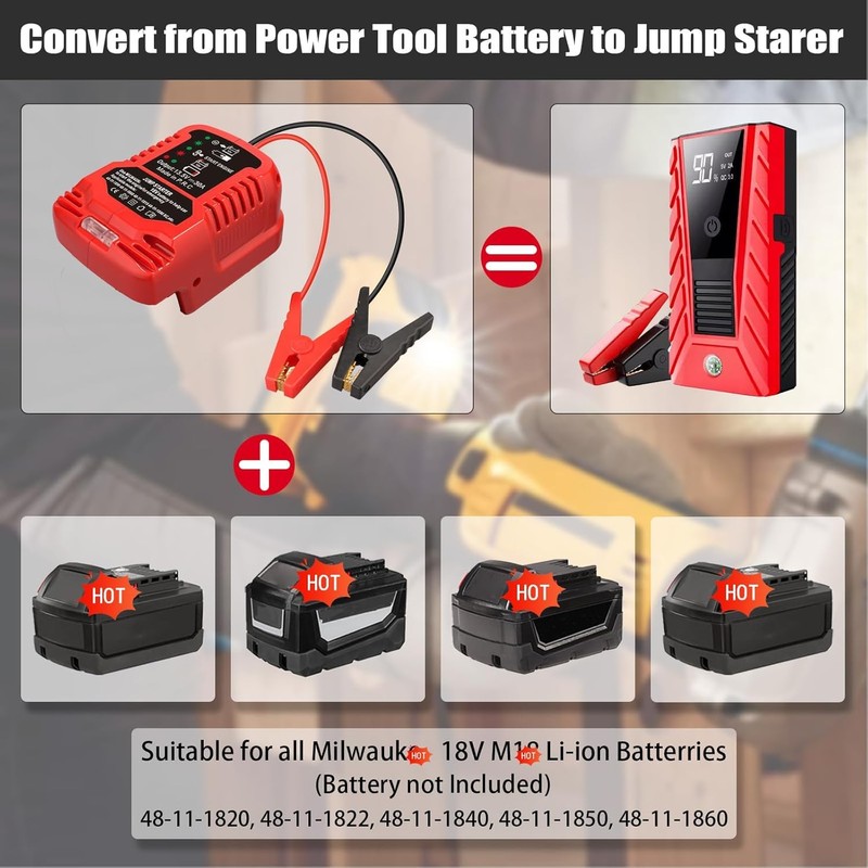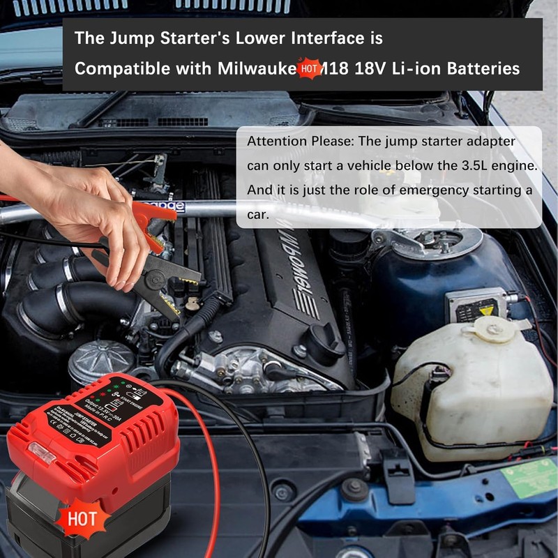 • The car jump cable adapter is Assist in starting, suitable for milwaukee M 18 batteries 18V lithium-ion batteries 48-11-1820 48-11-1822 48-11-1840 48-11-1850 48-11-1852 48-11-1860 48-11-1862. Car battery jump starter milwauke