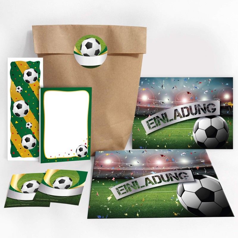 JuNa-Experten 12 Invitation Cards for Children's Birthday Party Football Party Invitations Including 12 Envelopes, 12 Bags/Natural, 12 Stickers, 12 Bookmarks, 12 Mini Notepads