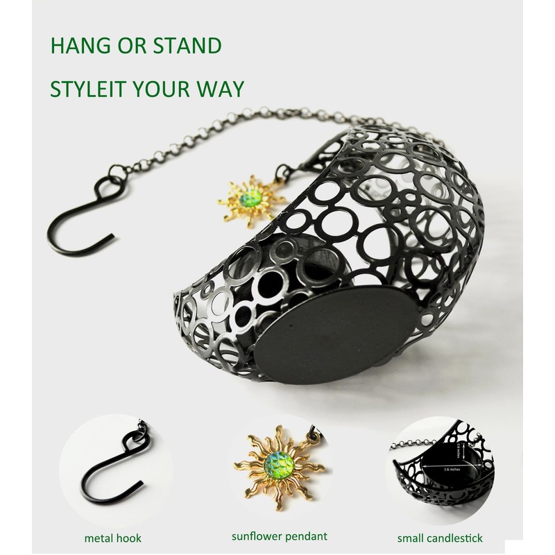 - [HOOK TO HANG]: Our moon holder comes with a 10-inch long chain with hook on the headband, so you can easily hang this thing. Also, the oval base will allow this moon candleholder to stand stably on the table/floor/window sill when you don't need to hang it