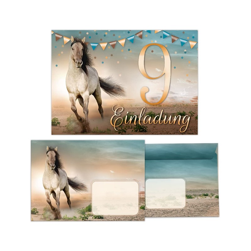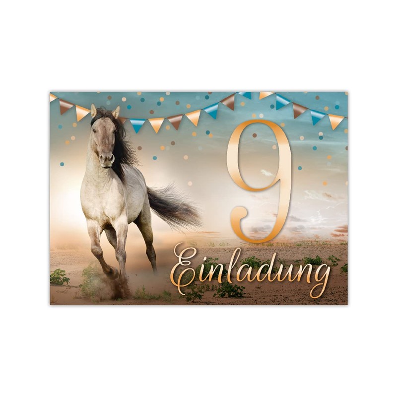 Junapack 12 Invitation Cards for 9th Children's Birthday Ninth Birthday Girl Horse Including 12 Envelopes, 12 Bags/Natural, 12 Stickers