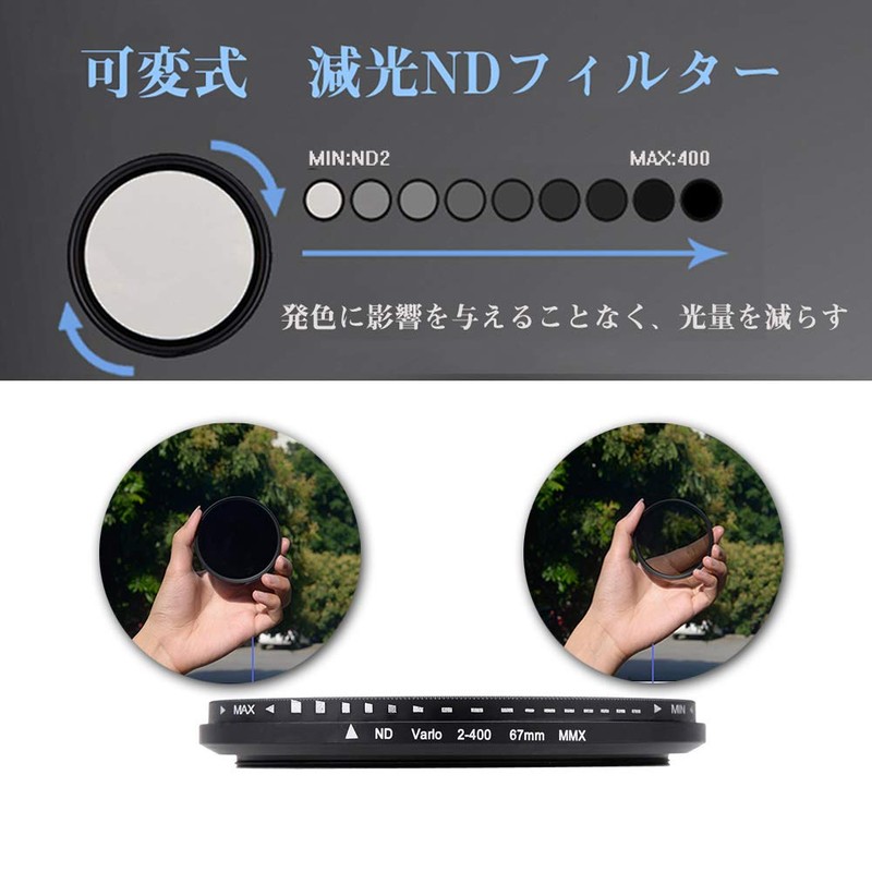 - Variable ND Filter: Neutral Density Range: ND2-ND400. A convenient variable type that allows you to freely change the filter frame from ND2 to ND400. No more preparation for you!