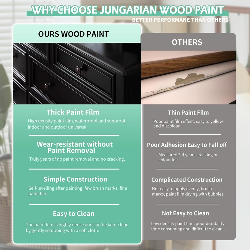 • 【Long Lasting Adhesion】JUNGARIAN Furniture Paint has strong adhesion, it can form a high-density film after drying. The acrylic paint can easily cover the marks, and can be a long-lasting wear-resistant paint, prolonging the life of furniture