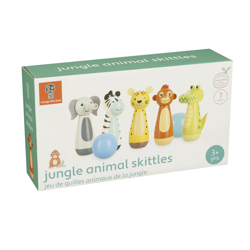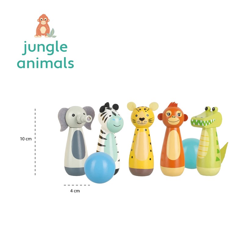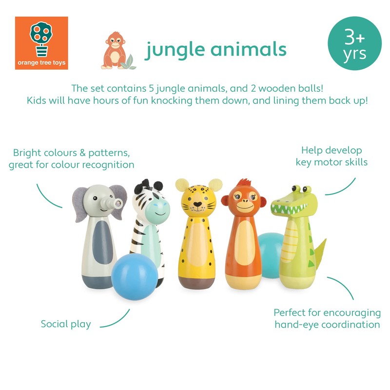 - DEVELOP KEY MOTOR SKILLS: Make friends with these beautifully hand crafted traditional wooden jungle animal skittles, including five cute and colourful jungle animals; an Elephant, a Zebra, a Leopard, an Orangutan and a Crocodile. This outdoor toys for toddlers age 3-5 comes with 5 skittles and two wooden balls