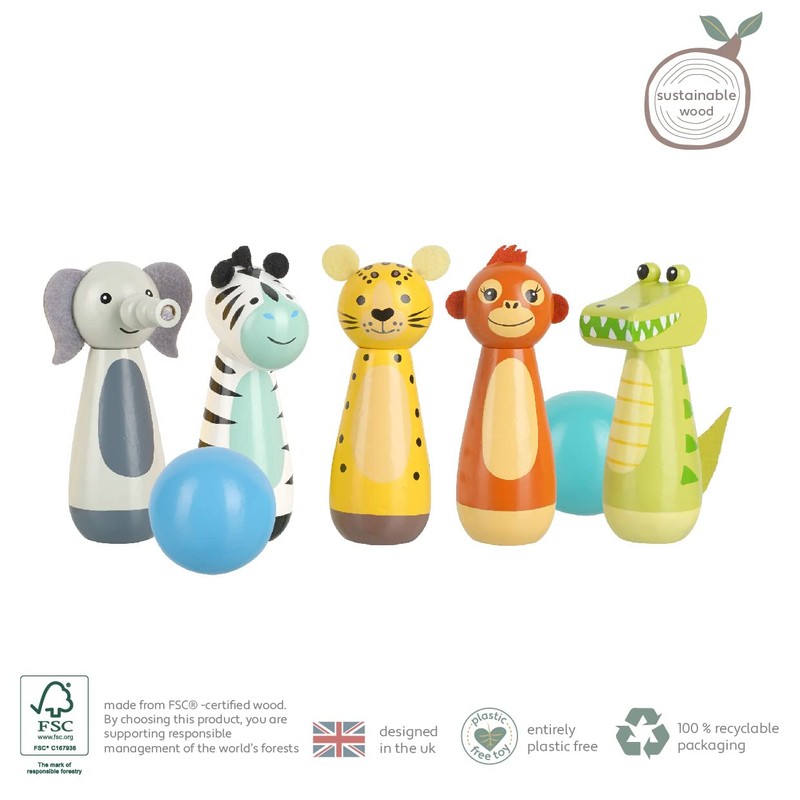 - PROMOTES DEVELOPMENT: Make learning fun; these classic jungle animal skittles are perfect traditional wooden toddler toys. Stand them up...and knock them down! Help your child to develop animal recognition, counting skills and hand-eye coordination. This wonderful keepsake will be treasured by children and parents