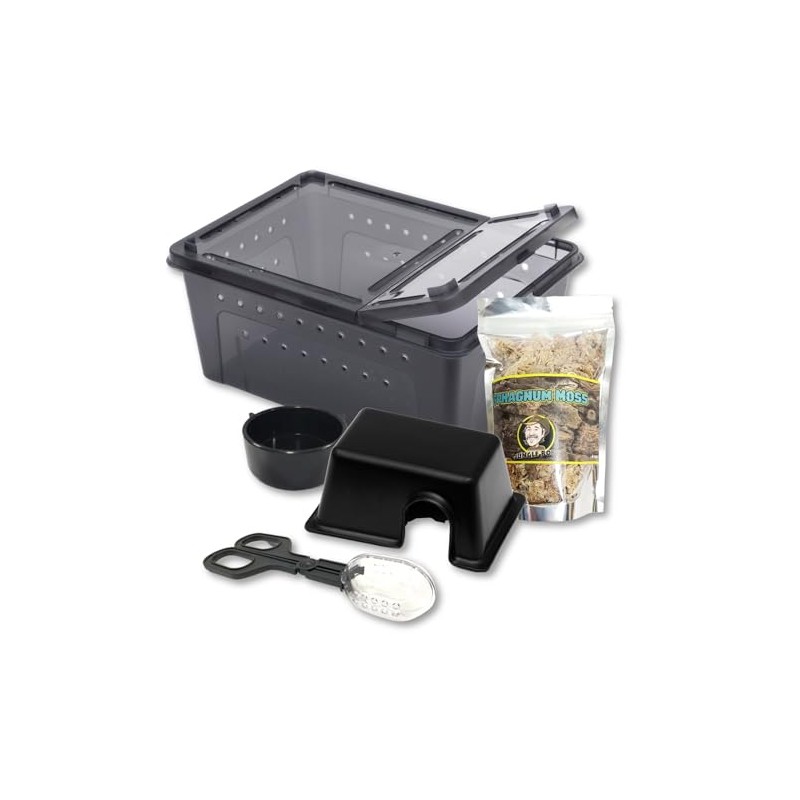 - REPTILE CARE BUNDLE: The ultimate kit for a thriving reptile habitat! Our 5-piece reptile care package makes a great starter bundle for any new reptile owner. This Medium Terrarium kit includes one 10.25" x 7" x 4.5" black plastic terrarium box, a small hide box, a grabber for handling feeder insects, a round corner bowl, and a 0.4oz pack of sphagnum moss.