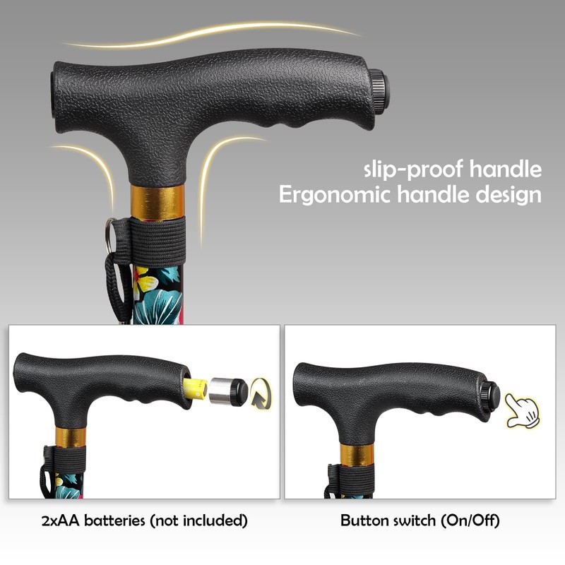 • 🎁【WALKING CANE WITH LED LIGHT】Built-in LED guide light that is convenient to walk at night and illuminate the road under your feet. The bright light will safely guide you in the dark. The battery is 2*AA(AA battery doesn’t include)Note: After the battery is put in, please tighten the battery cover and rotate until it cannot be rotated, otherwise the light will be off easily