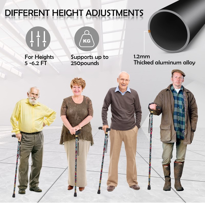 Why Choose Our JUNRA Walking Cane? ADJUSTABLE HEIGHT  The cane has 5 levels of telescopic adjustment; you can adjust the height in a 1-inch increment from 33'' to 37'' to customize to your fit; which is suitable for most people. COLLAPSIBLE DESIGN  Foldable, Collapsible;  Comes with a travel bag; making it easy to travel and store. FREE STANDING The wide slip-resistant quad base allows the cane to stand firmly on its own;  with a comfortable T-shape handle making the cane doesn't slip out of your hand. LED LIGHT The walking cane uses LED strong light illumination; Which is convenient for walking at night DURABLE MATERIAL The walking stick is made of lightweight and durable aluminum alloy material Which is sturdy, durable, and corrosion-resistant Tube thickness is 1.2 mm,1.5 times that of others.   What’s in the Package? 1 x Walking stick 1 x Storage bag