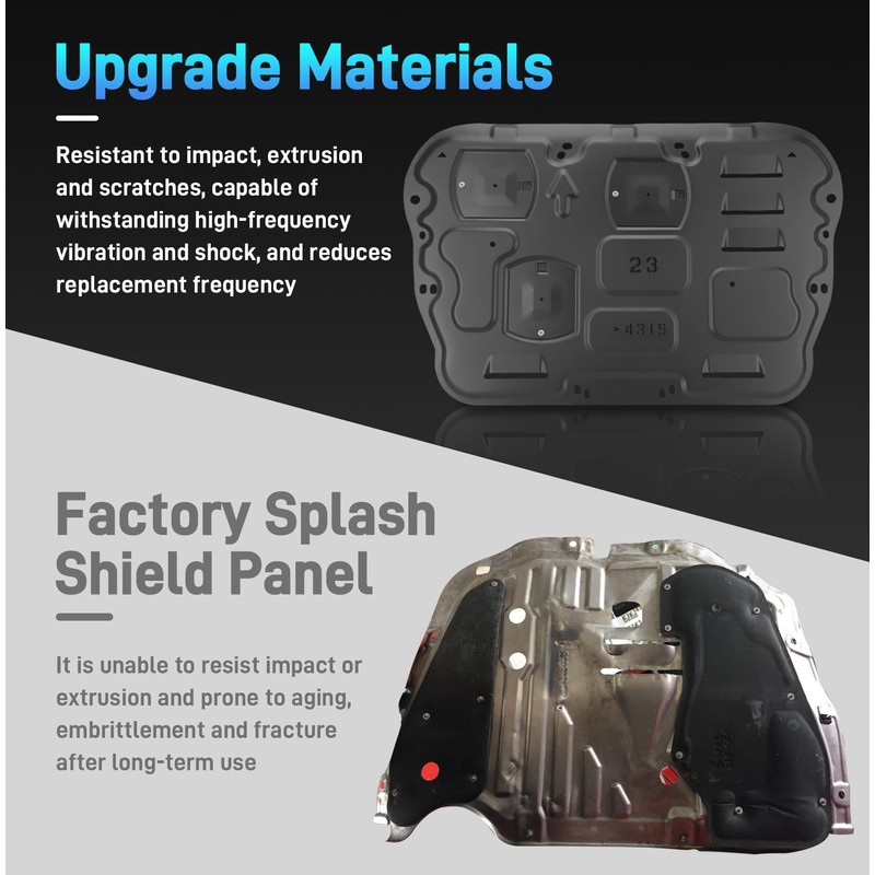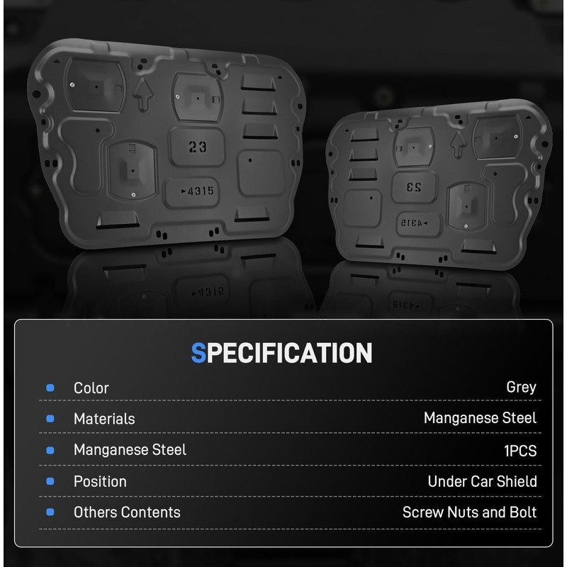 - [Upgrade Material]: Say goodbye to the fragility and vulnerability of ordinary materials! Our newly upgraded Engine Splash Guard is crafted from 0.6inch thick manganese steel, with significantly enhanced strength compared to the original version. It is impact-resistant, deformation-resistant, and built to withstand daily scrapes and harsh road conditions. With a greatly extended service life, it provides your vehicle with comprehensive, long-lasting, and reliable protection
