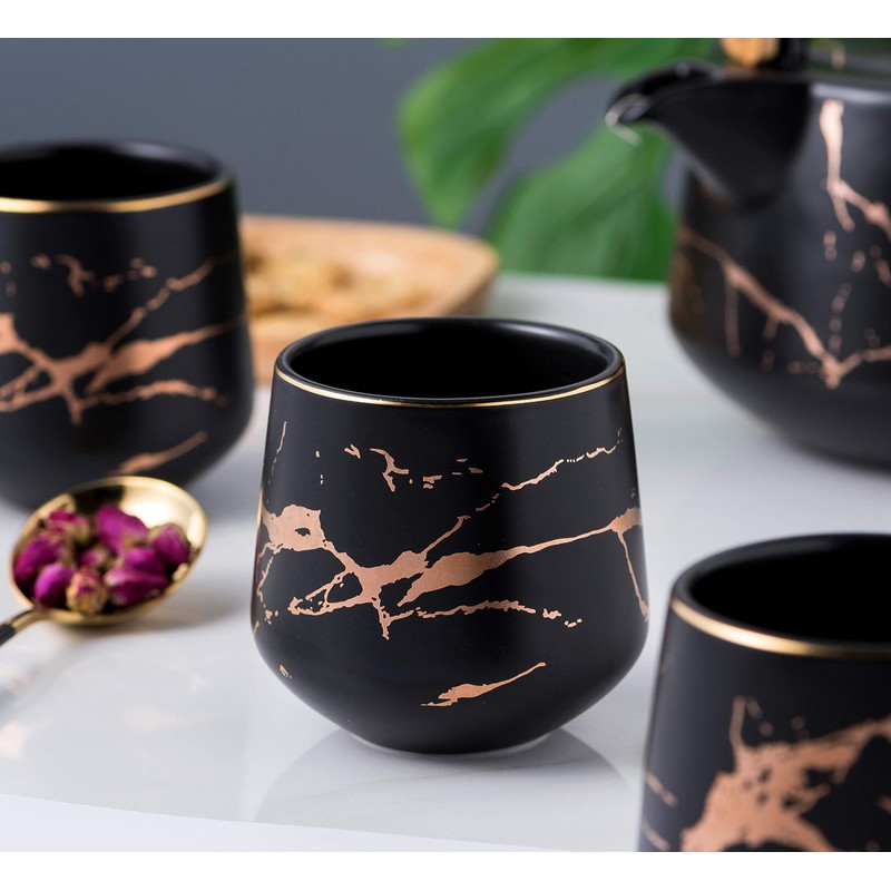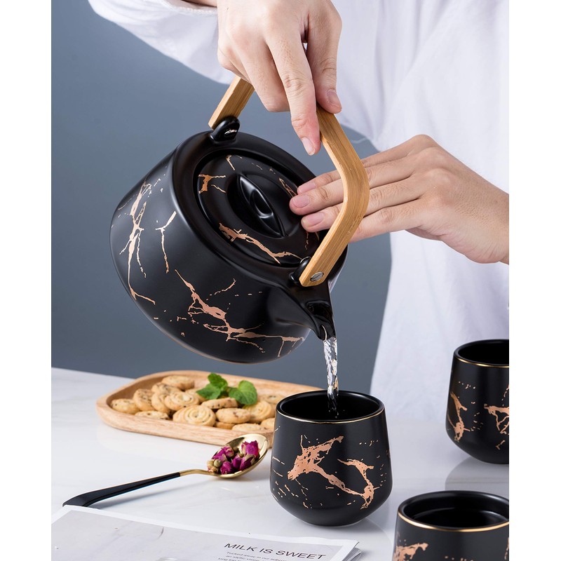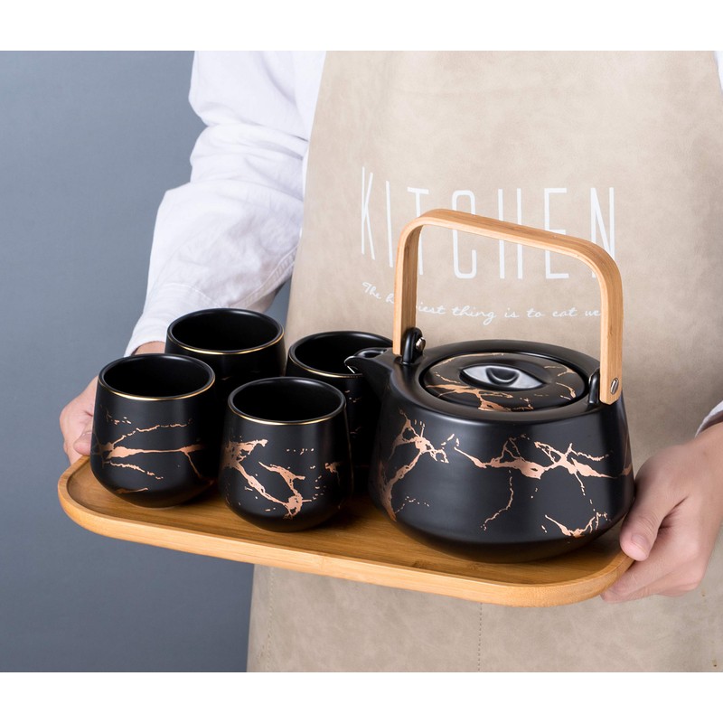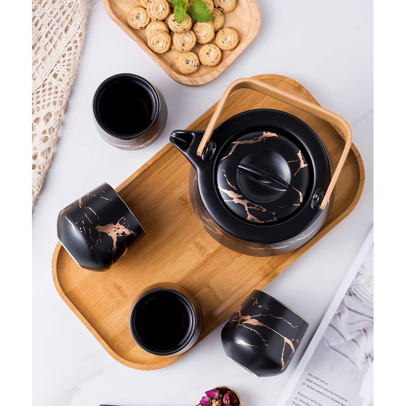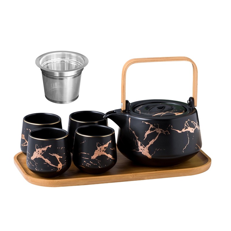 Jusalpha Marble Porcelain Teapot Set Modern Japanese Tea Pot with Infuser for Loose Tea, 4-Piece Tea Cups (6.7 OZ) with Bamboo Tray - Tea Cups Set for Home and Restaurant, FDJPT4 (Black)