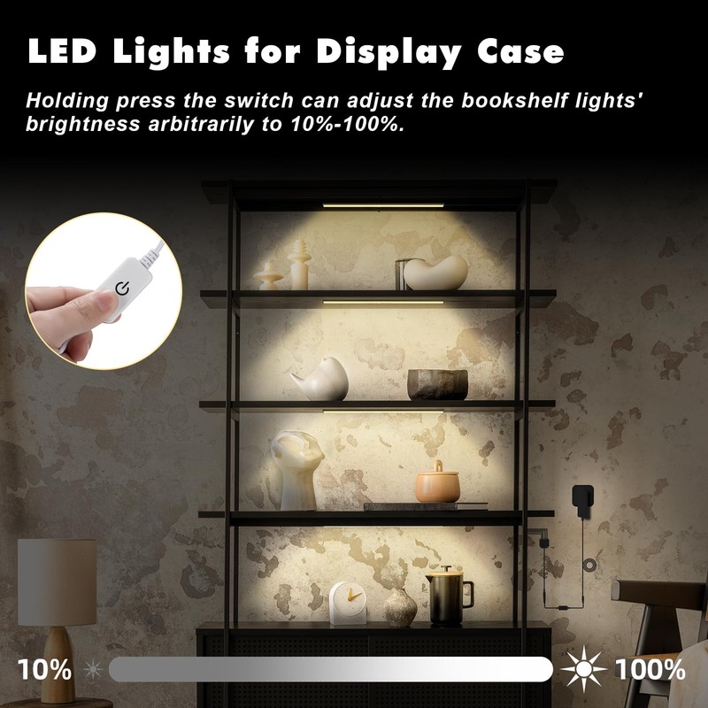 - 💡"Convenient" - These display case lights are much superior to fluorescent lighting and are dimmable. Holding press the switch can adjust the bookshelf lights' brightness arbitrarily to 10%-100%. The lighting can be adjusted to its most attractive setting. Not only that, the shelf lighting will remember the last setting used when you turn it on again.