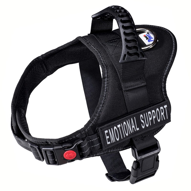 A durable Emotional Support dog harness that's comfortable, too. Your Just 4 Paws Harness Jacket is crafted from top-quality, breathable mesh & features reflective stitching and Velcro Hook and Loop patches and chest straps with quick-release locking buckles for added safety. When you're training a Emotional Support dog, distractions from dog-loving strangers, or being denied access to businesses with "no pet" policies can cause trouble for both you and your working dog. With a clearly marked harness jacket, smany business owners, as well as strangers all instantly recognize your dog’s status. You and your dog will have the space and respect you both deserve. Of course, just like any working dog, your partner isn't always on the clock. That's why your Just 4 Paws Emotional Support dog harness jacket comes equipped with removable patches. Take them off for playtime or replace them with "Do Not Pet" or “In- Training” patches (sold separately) to keep well-meaning strangers away. No need to buy a second vest! Reflective Stitching and Patches. Comfortable mesh lining. Heavy-duty, double-stitched nylon. Removable Velcro Hook and Loop- backed patches. Includes attached Rubber Padded handle and "D" ring for leash. Guaranteed for life.