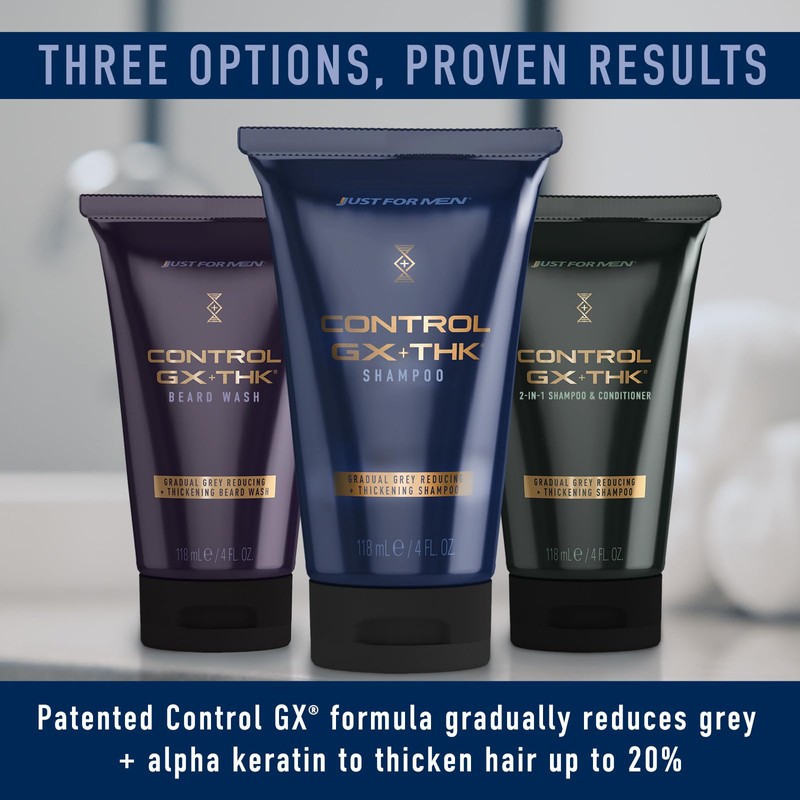 JUST FOR MEN Control GX + THK Thickening Shampoo with Grey Reduction, Shampoo for Thinning Hair with Alpha Keratin, Thickens Hair Up to 20%, Works with Every Hair Texture, 4 oz