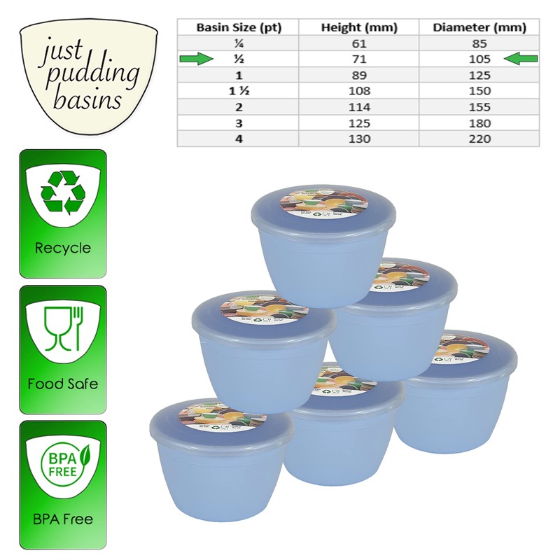 - Pack of 6 Small - Medium Size 0.5pt Basins and Lids, great for larger individual puddings